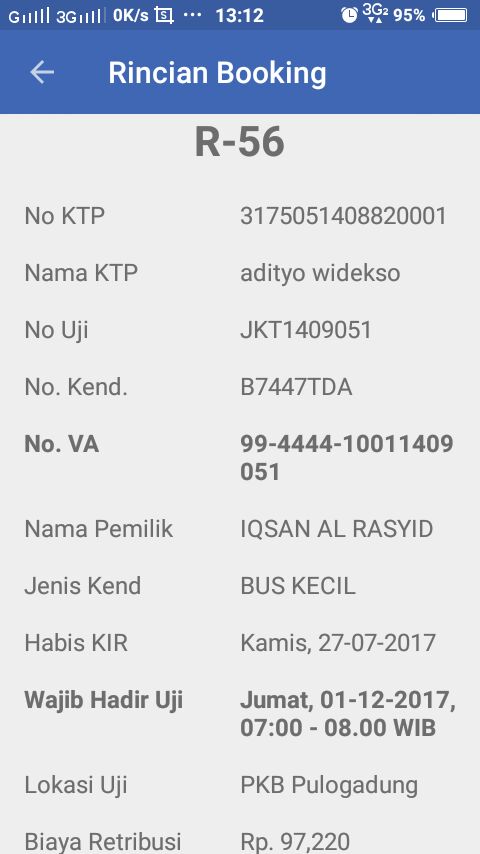 Anda akan mendapatkan Kode Boking yang berisi data kendaraan Anda dan Nomor Virtual Account yang berfungsi sebagai kode bayar Anda di ATM Bank Dki